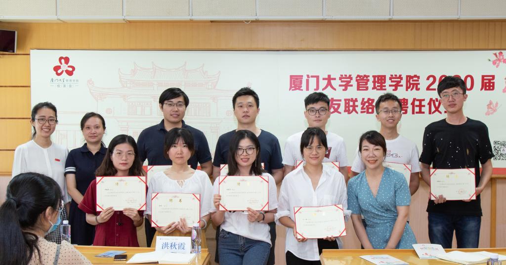 6月19日下午,学院校友办公室在嘉庚一207教室举行“2020届毕业班年级联络员聘任仪式”,学院党委副书记洪秋霞老师,毕业班辅导员邵亢邑老师、高瑜聪老师,学院校友办公室杨南燕老师,以及各系和中心负责校友工作的刘银燕老师、汤晓玲老师、廖晓虹老师、陈燕鹭老师共同出席了仪式。