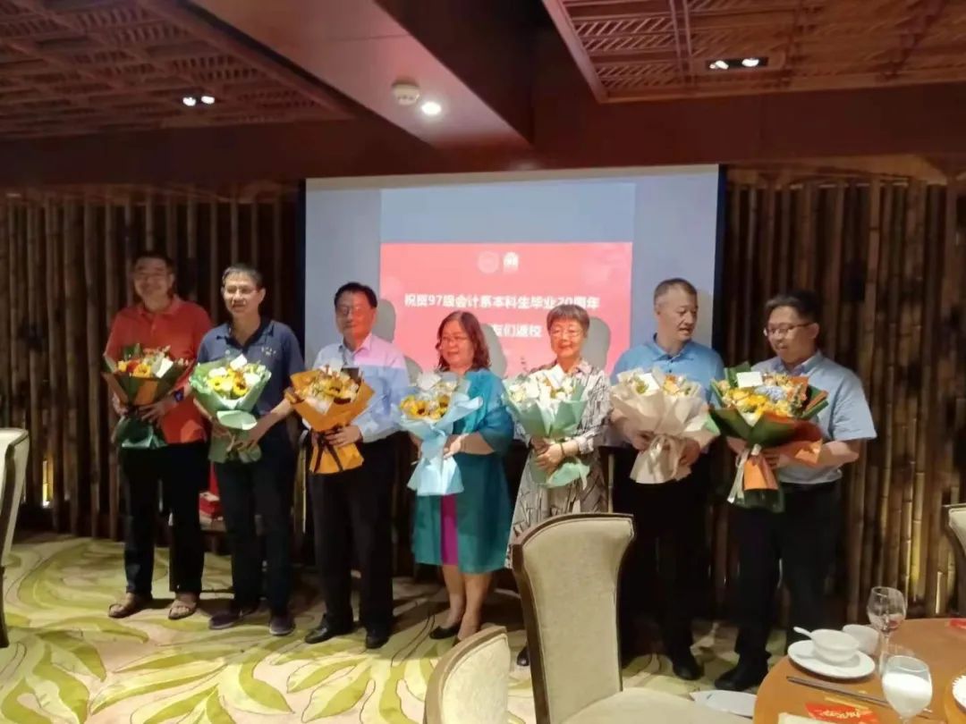 傍晚时分,97会计系友相聚林梧桐楼,为我们亲爱的老师们敬上鲜花,珍馐美馔亦不足以表达感恩的心。