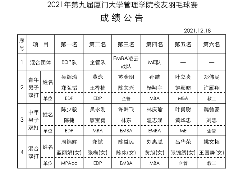 比赛中,每一位参赛选手都拼尽全力,为系\中心争光,发扬友谊第一比赛第二的优良传统,彰显厦大人的体育精神。EDP球队发挥稳定,连续第六年夺得团体第一的骄人成绩;MPAcc羽毛球队新秀蓝丽娟和周锦辉首次参赛就一举获得混合双打冠军,实力不容小觑!各队伍更是有不少老将,连续多年参赛,他们配合默契,你追我赶,争取打好每一个球,把体育精神表现得淋漓尽致,用汗水带领他们的队伍取得更好的成绩,留下了难忘的回忆。