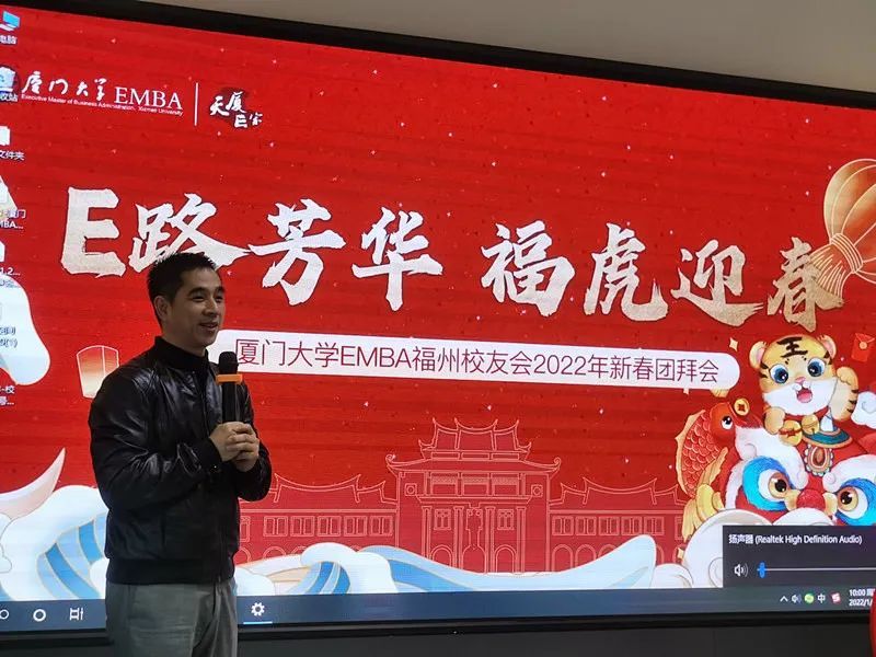 上午9:30,正式会议开始,执行会长黄伏虎做开场致辞,为校友们送上新春祝福,充分肯定了厦大EMBA福州校友会在过去一年的所有工作,展现出对校友会精神的传承,工作的接力都给予肯定与鼓励,以及对2022年的全年计划安排,并向广大校友长期以来对福州校友会的关心支持及为本次团拜会辛勤付出的各位同学表示感谢。