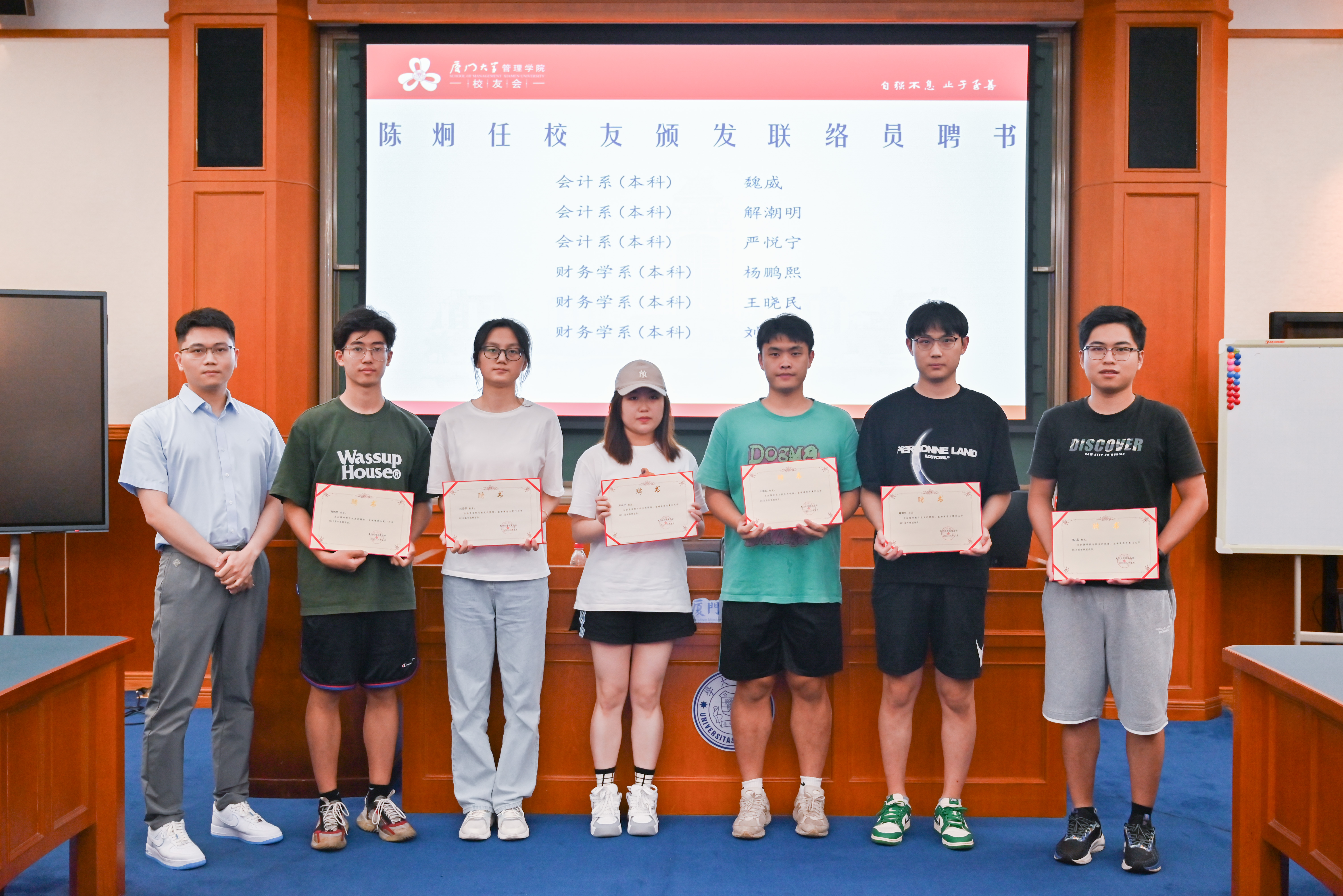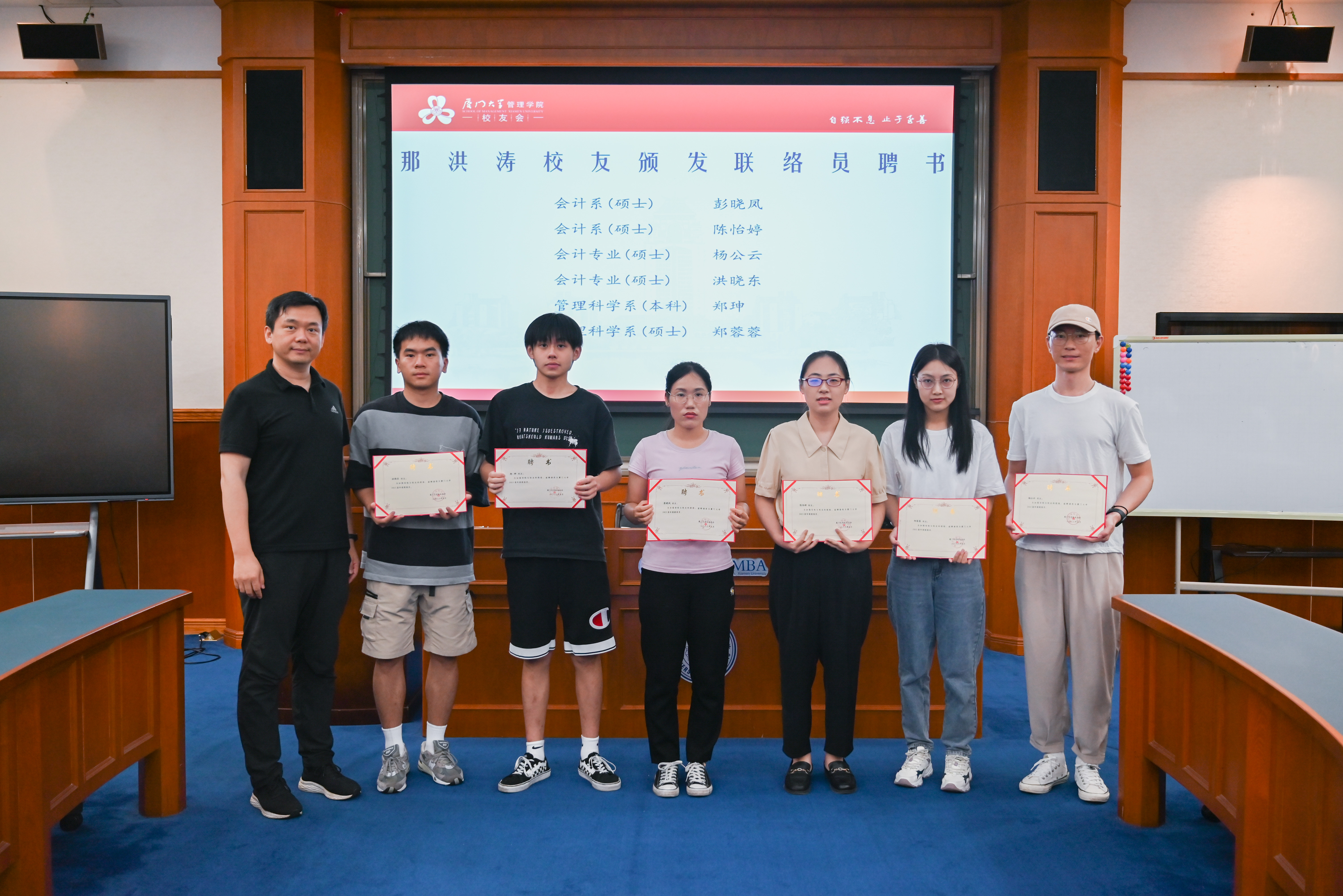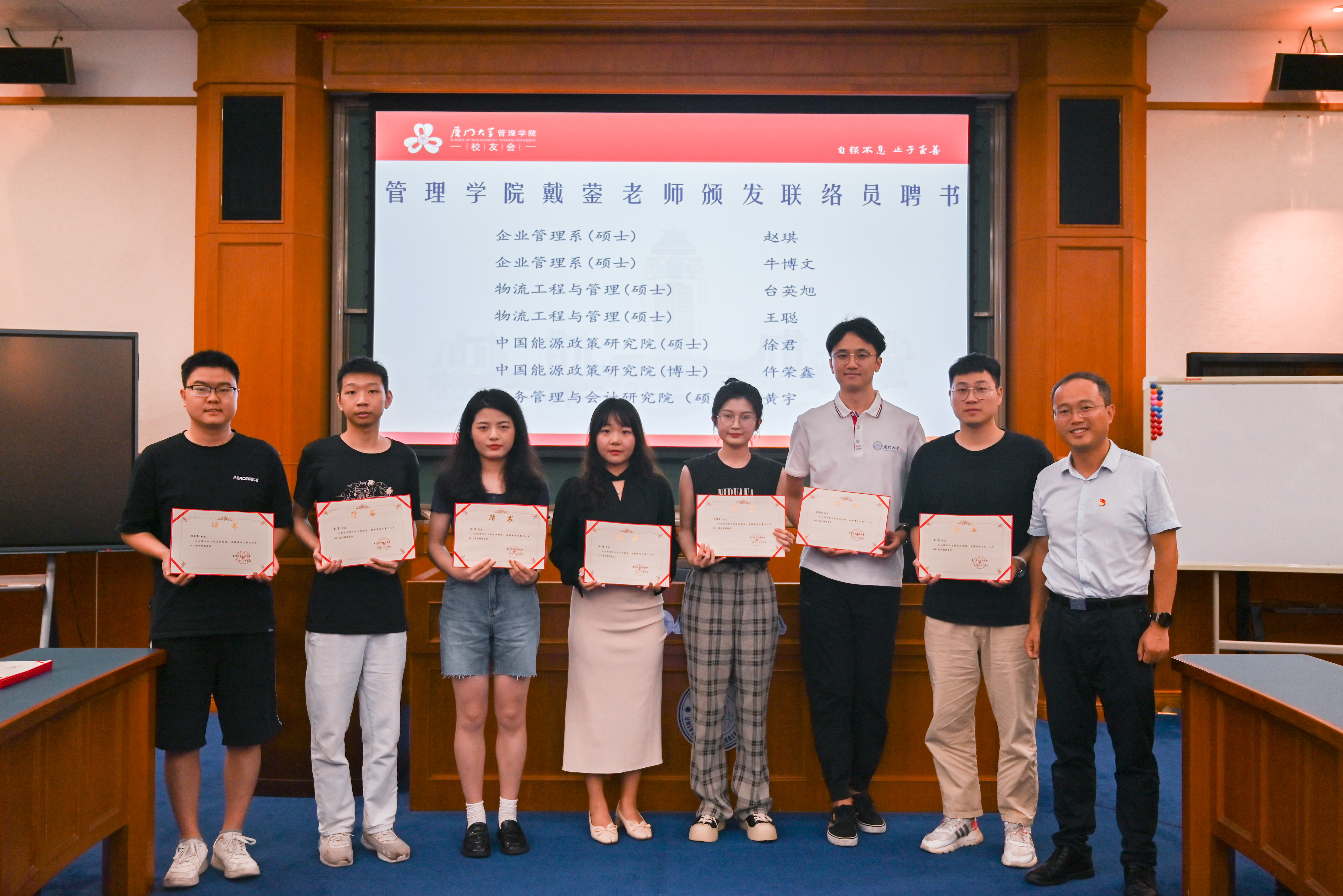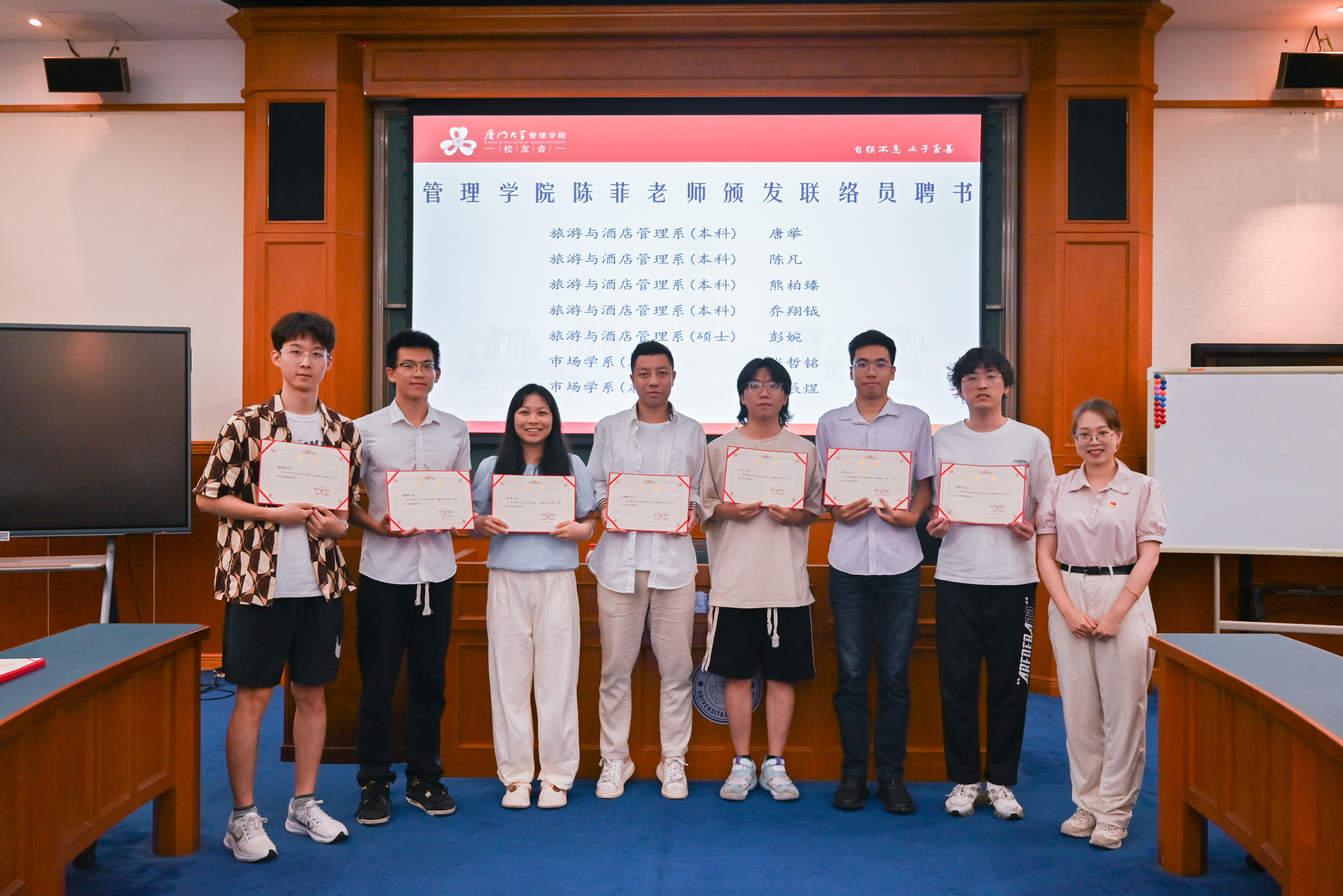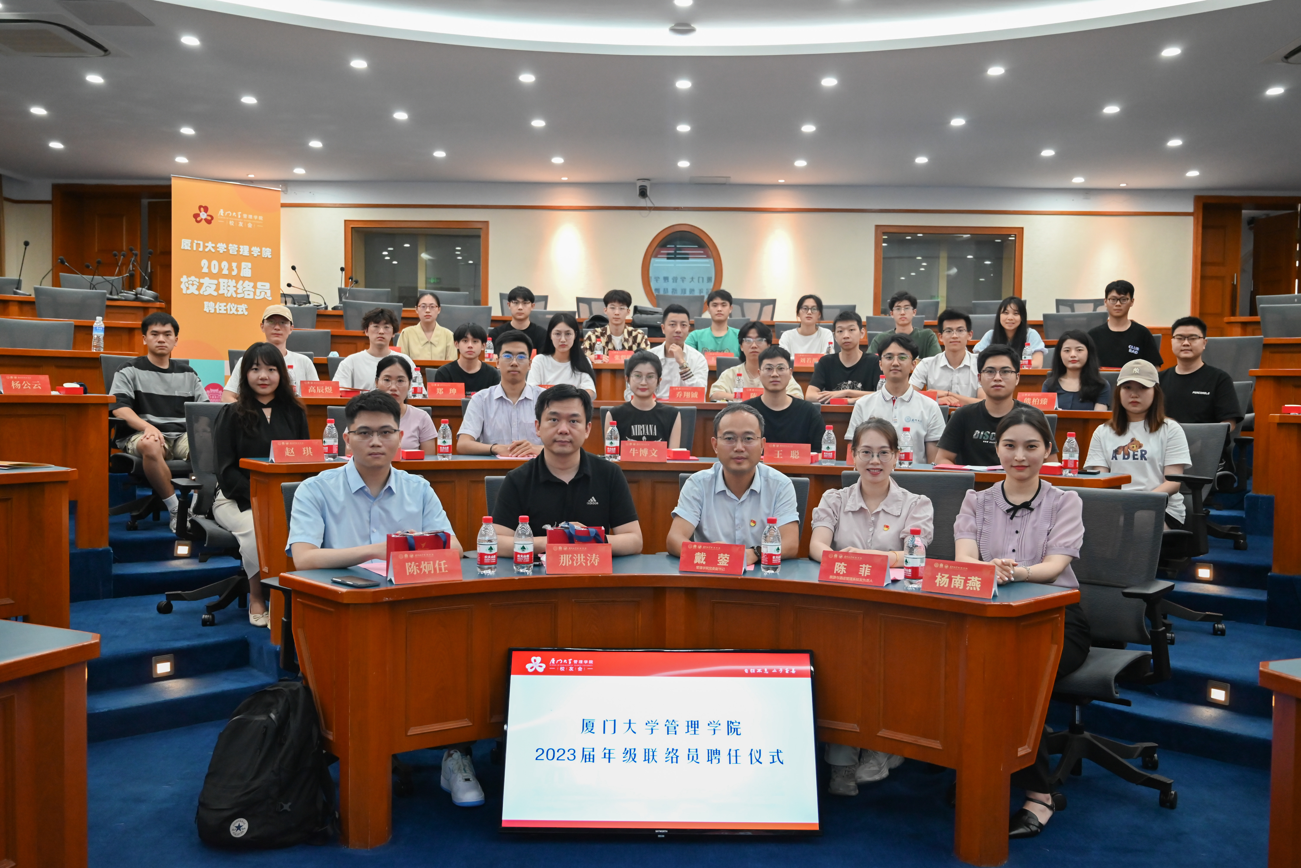 6月9日下午,厦门大学管理学院2023届年级联络员聘任仪式在群贤二204教室举行。学院党委副书记戴蓥、旅游系陈菲与来自全院各学系26名2023届本、硕、博毕业生年级联络员代表参加。2003级会计系/2016级MBA校友那洪涛、2014级会计系校友陈炯任作为联络员学长代表一同参加了仪式。仪式由校友秘书杨南燕主持。
