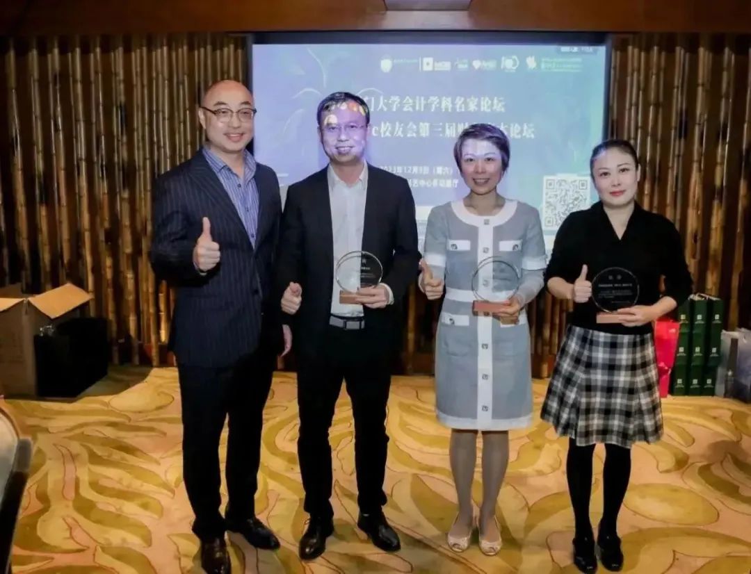 校友资源是学院宝贵的财富,各位校友在事业上取得成功的同时,也为在校的学弟学妹树立榜样,创造机会,为会计学系的建设不断贡献自己的一份力量。MPAcc教学秘书陈桂宝老师向陈展、金晶、陈惠鹏和林溪发校友颁发“校友贡献奖”。“桃李不言,下自成蹊”,陈慧鹏校友代表获奖校友向学校和老师表示诚挚感谢。